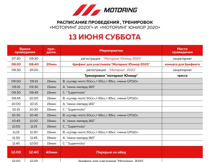 Опубликовано расписание на 13-14 июня ADM Raceway (Мячково) Сегодня стало доступно расписание заездов для первого этапа текущего года серии гонок Motoring и Motoring Junior. Гонки пройдут в подмосковном Мячково 13-14 июня 2020 года на трассе ADM Raceway. Скачать расписание можно по ссылке….