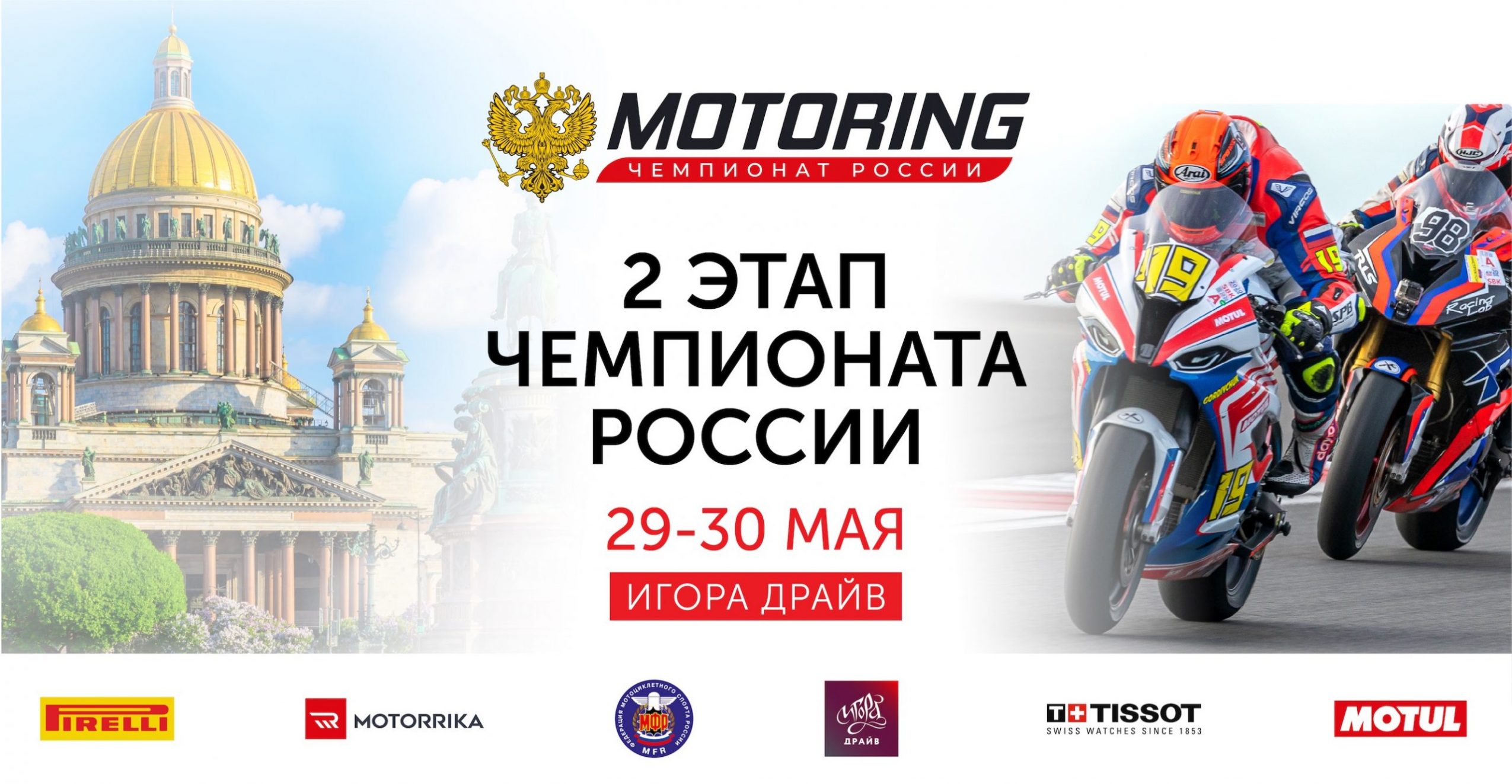 29 и 30 мая на Автодроме «Игора Драйв» пройдет второй этап Чемпионата Motoring. В субботу пилотов ждут тренировочные заезды и квалификации. Эффектным завершением дня станет трехчасовая гонка Эндуранс. Главный гоночный день состоится на Автодроме в воскресенье: жаркие баталии пройдут в классах Superstock 1000, Superstoc…