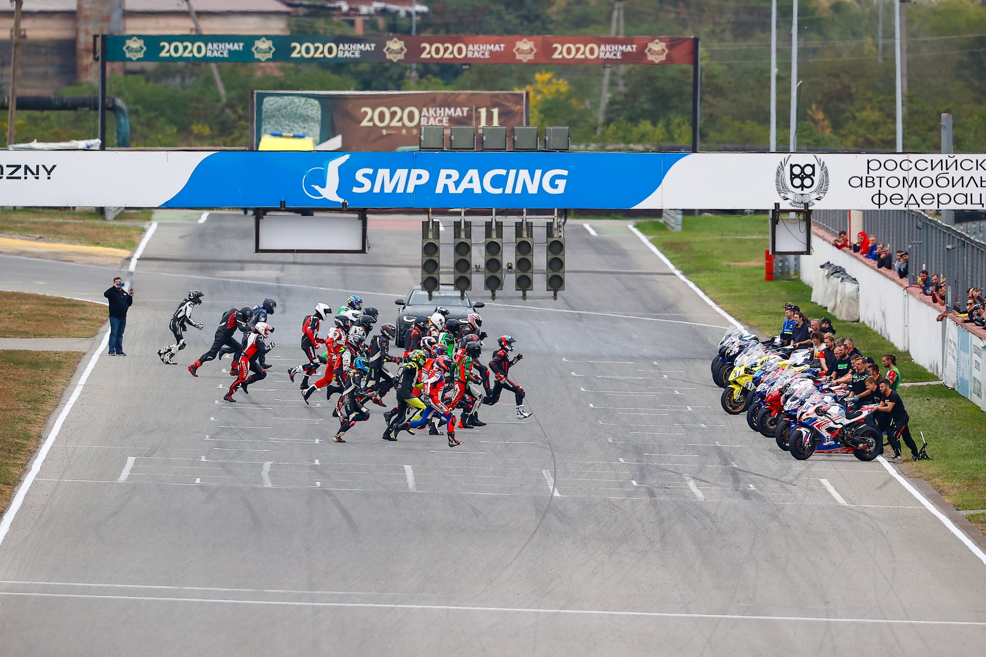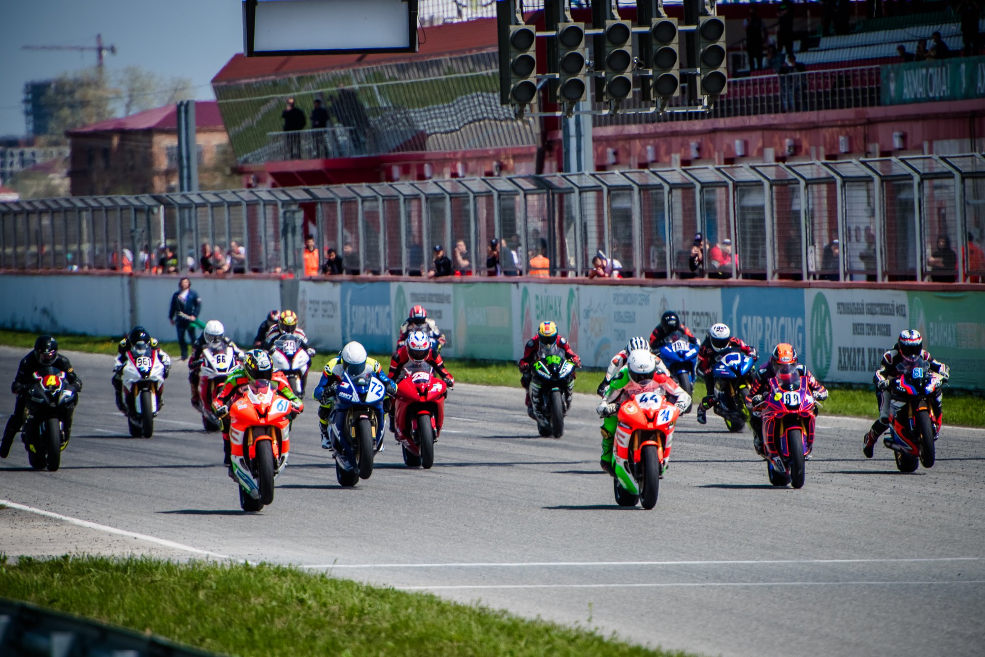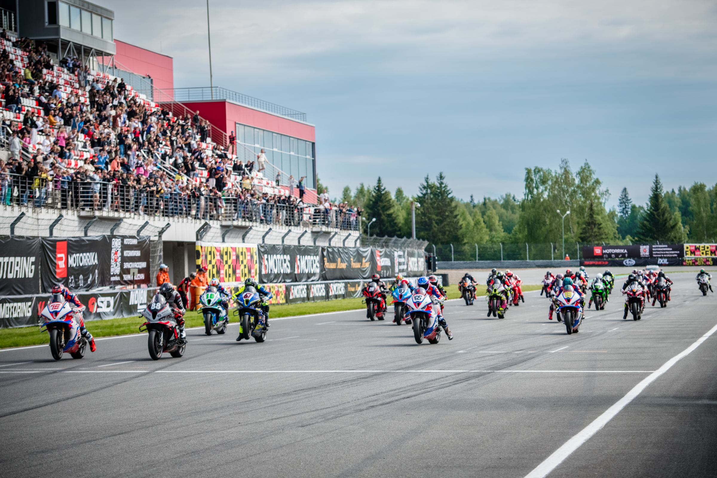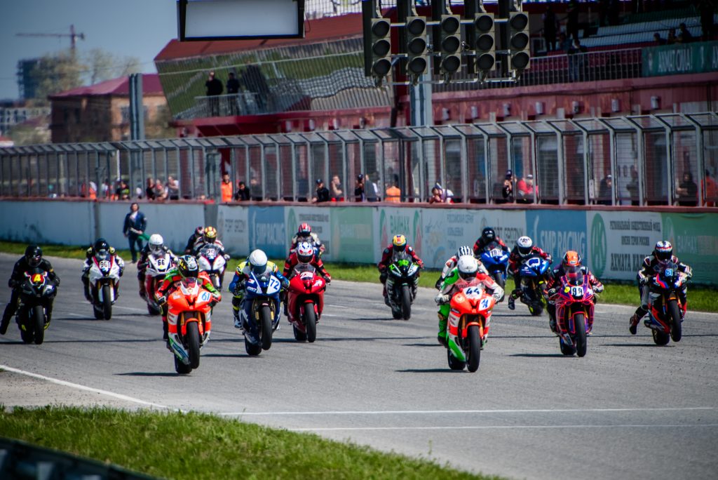 Несмотря на хмурое небо, казалось, тучи изо всех сил сдерживали дождь, и первая гонка Чемпионата была объявлена «сухой». Едва красные светофоры погасли, в бой рванули 24 мотоцикла гонщиков объединенных литровых классов Superbike и Superstock 1000. Со второго круга лидер заезда Макар Юрченко начал один за другим штампов…