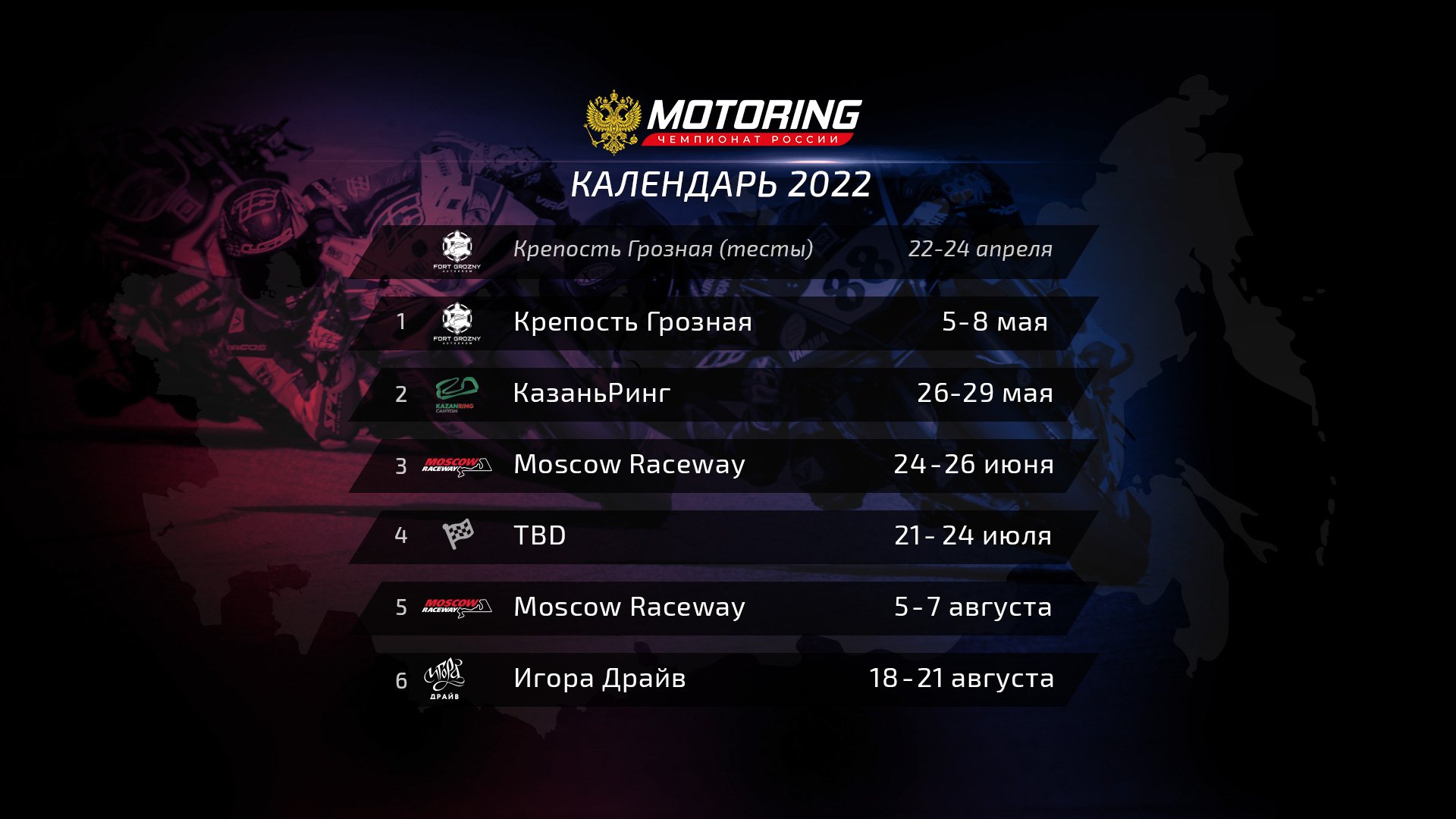 Утвержден календарь проведения Чемпионата Motoring 2022: в следующем году участников ждут шесть этапов. Перед стартом сезона будут организованы официальные тренировочные сборы в Грозном. Презентация нового сезона и церемония награждения победителей Motoring 2021 пройдет в марте. Точную дату мероприятия мы сообщим заран…