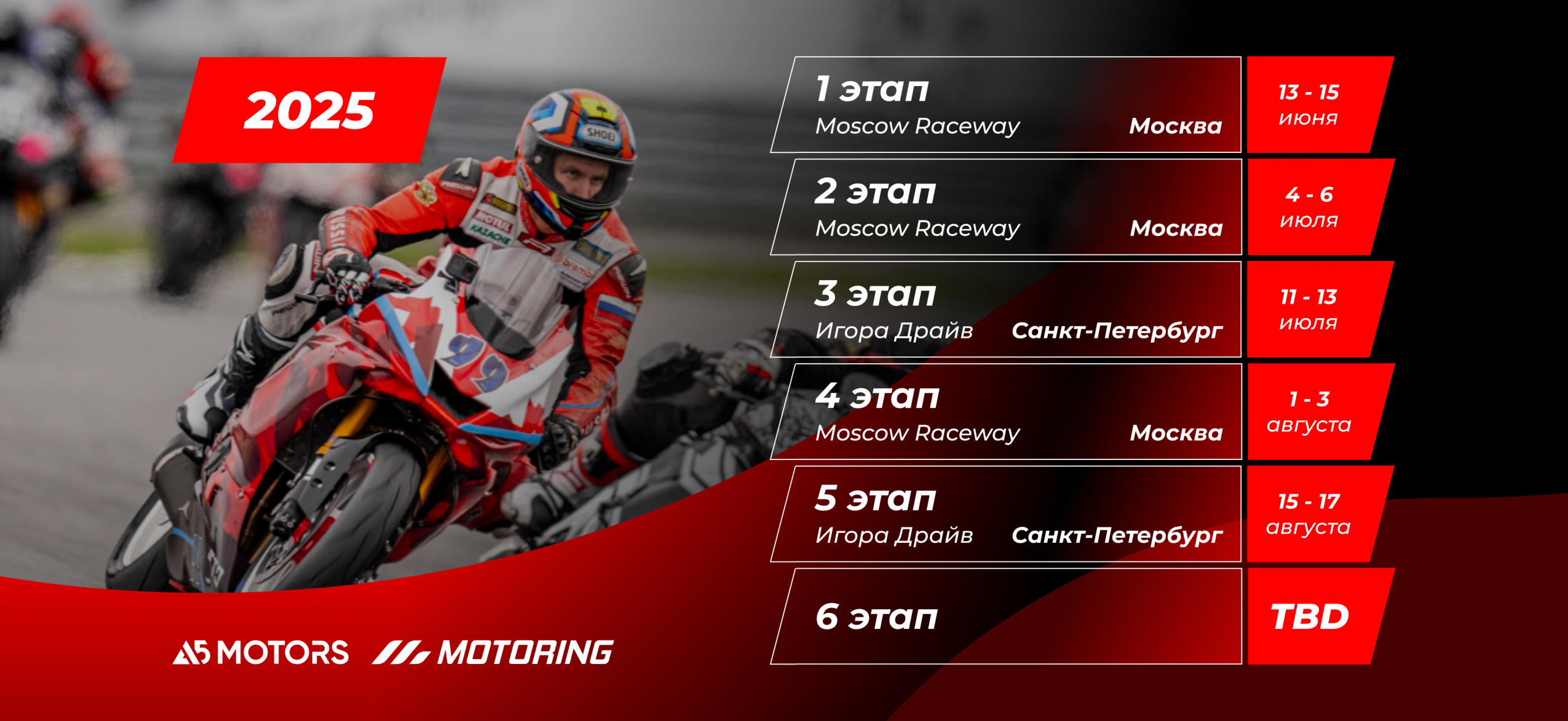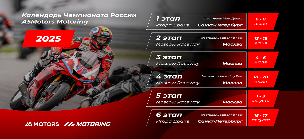 A5Motors Motoring стал Чемпионатом России! В 2025 году серия шоссейно-кольцевых мотогонок A5Motors Motoring официально получила статус Чемпионата России. Соревнования пройдут на трассах Moscow Raceway и «Игора Драйв» и будут сопровождаться фестивалями Motoring Fest. Календарь Чемпионата России по шоссейно-кольцевым мот…