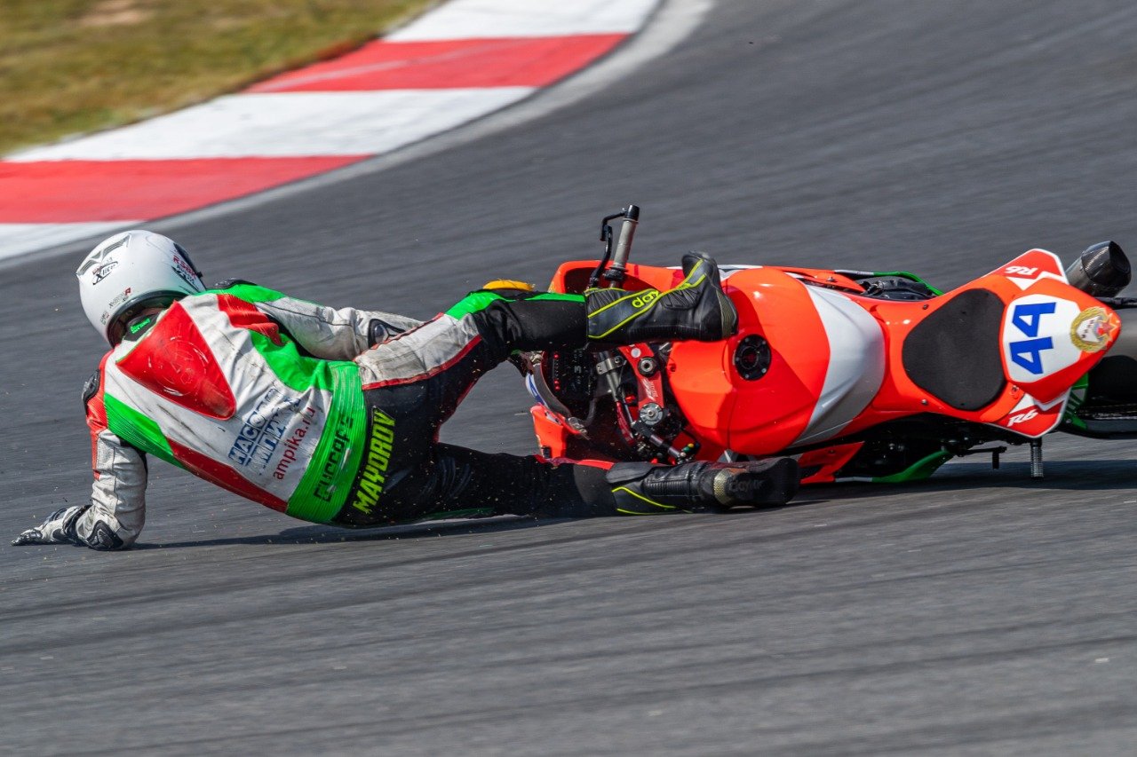 В гонке класса Supersport два самых быстрых гонщика – Антон Еремин и Дмитрий Седин – ехали во главе пелотона, не упуская друг друга из виду. Увы, Антон Еремин выбыл из борьбы за первое место буквально за круг до финиша из-за неожиданного падения. Но опытный пилот поднял мотоцикл и сумел завершить гонку на 4 позиции. И…