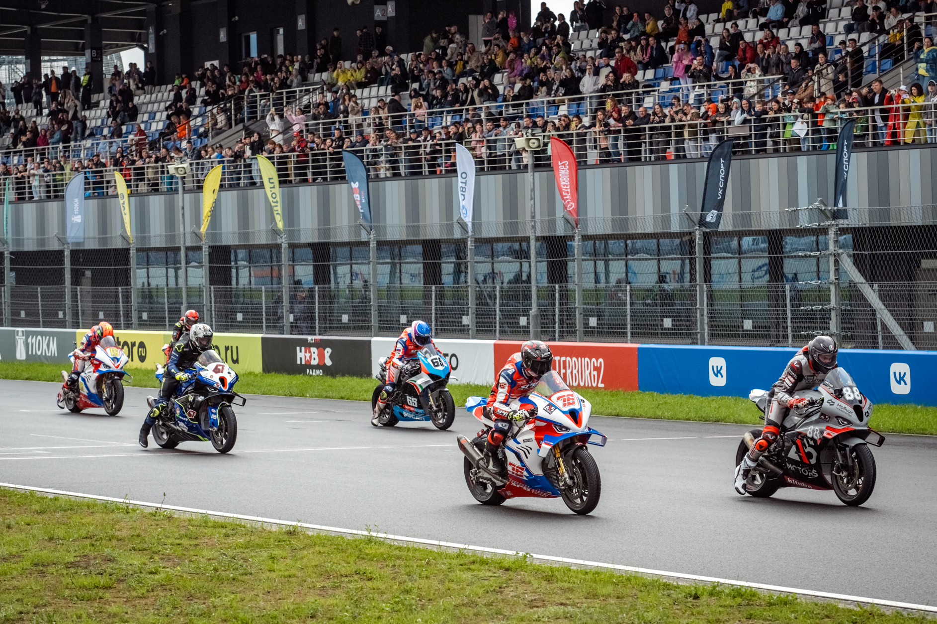Несмотря на хмурое небо, казалось, тучи изо всех сил сдерживали дождь, и первая гонка Чемпионата была объявлена «сухой». Едва красные светофоры погасли, в бой рванули 24 мотоцикла гонщиков объединенных литровых классов Superbike и Superstock 1000. Со второго круга лидер заезда Макар Юрченко начал один за другим штампов…