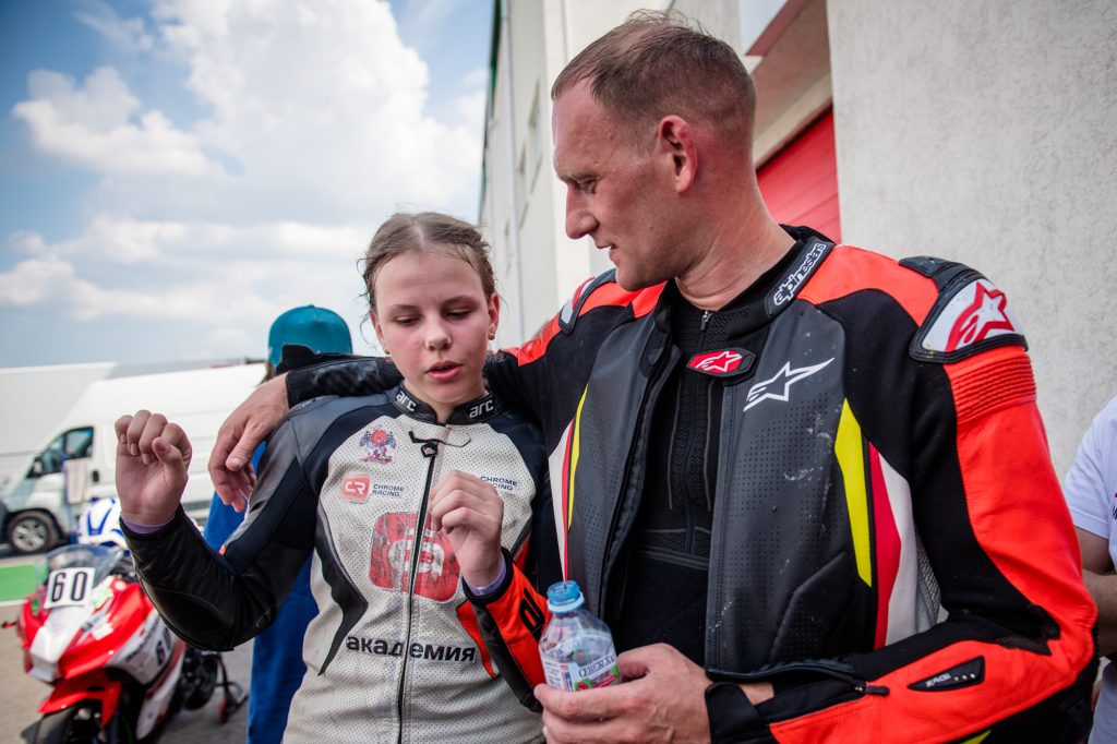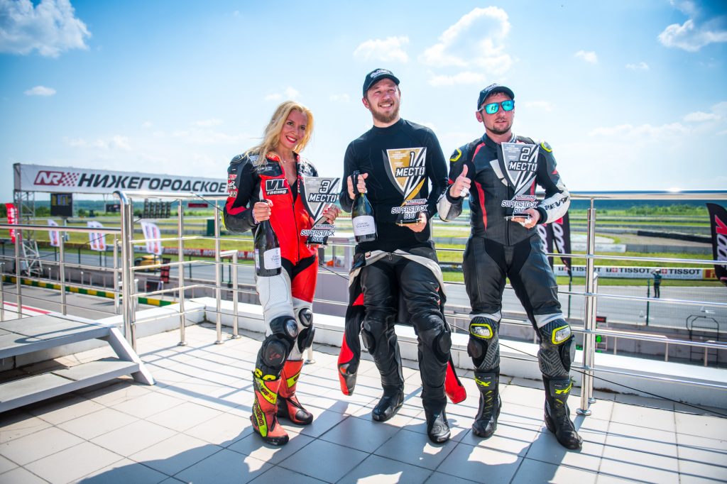 Наконец, стартовали гонки старших классов: Superbike и Supersport. В «литрах» зрители трансляции, затаив дыхание, наблюдали за тем, как Макар Юрченко и Владимир Леонов, два сильнейших гонщика Чемпионата, вновь сошлись в очной борьбе за лидерство. Первая дуэль двух однокомандников на втором этапе в Санкт-Петербурге завершилась вылетом Леонова с трасы на последнем круге. Со старта оба пилота оторвались от пелотона. Макар ехал первым, Владимир преследовал партнера по команде, выжидая удачный момент для атаки. Один раз пилоты разменялись позициями – однако Макар почти сразу вернул лидерство. Увы, всего за несколько кругов до финиша мотоцикл Леонова перегрелся и начал терять скорость. Этим воспользовался Артем Мараев, сумевший объехать Владимира и занять вторую строчку итогового зачета и оставивший именитому гонщику третью ступень пьедестала.