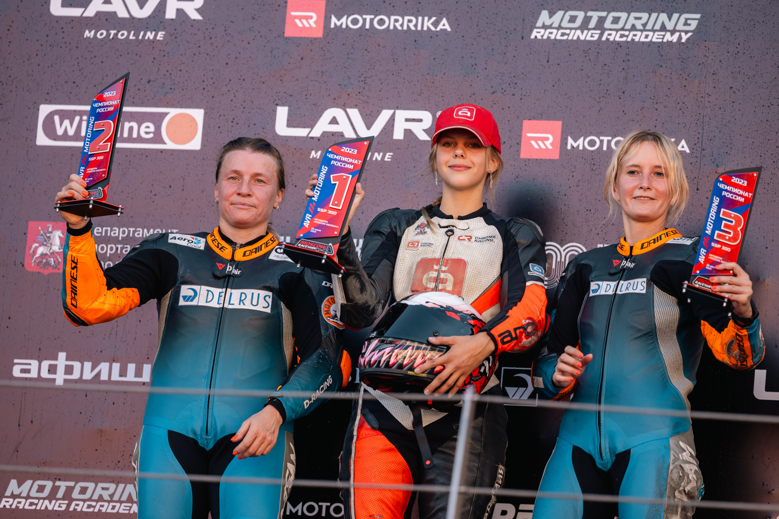 В «трехсотках», наконец, впервые в этом сезоне мы вновь увидели женский подиум. Лидер класса и двукратная чемпионка, Анастасия Белякова, вновь оторвалась от преследователей и уехала далеко вперед. На этот раз Мария Медведева, ее ближайшая соперница, не выезжала в квалификациях – и в гонку отправилась с предпоследней позиции. Мария уверенно прокладывала себе путь на подиум, пока за вторую позицию боролись Екатерина Колпакова, Сергей Соловьев и Максим Королев. Победила в этой схватке Екатерина, Максим сошел с дистанции за несколько кругов до финиша, Сергей выбыл из борьбы из-за технической неисправности. Мария Медведева все же добралась до второй позиции, успешно атаковав Колпакову в последнем повороте. Екатерина заняла третье место на пьедестале почета.